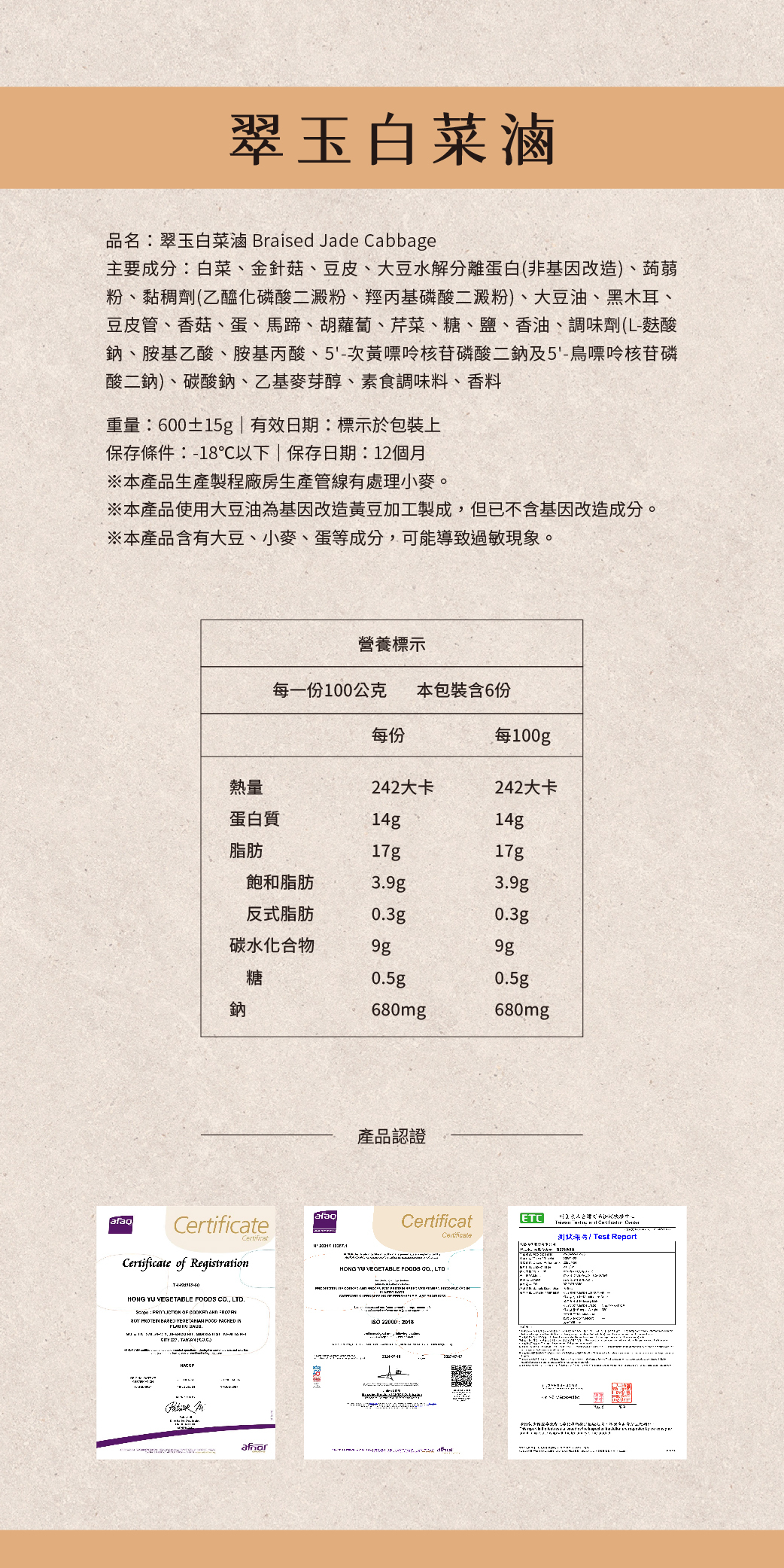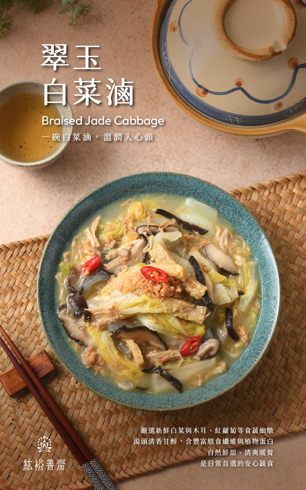 ■ 翠玉白菜滷嚴選鮮嫩大白菜為主角,搭配金針菇、木耳、豆皮等多樣蔬食素材,佐以香菇高湯與醬香湯底慢火燉煮,湯頭清香甘醇,內料豐富實在,層次分明。口感溫潤爽口,不油不膩,是居家餐桌、便當配菜或火鍋湯底的最佳選擇。全素調味、無五辛、無動物性成分,蛋素者安心享用。