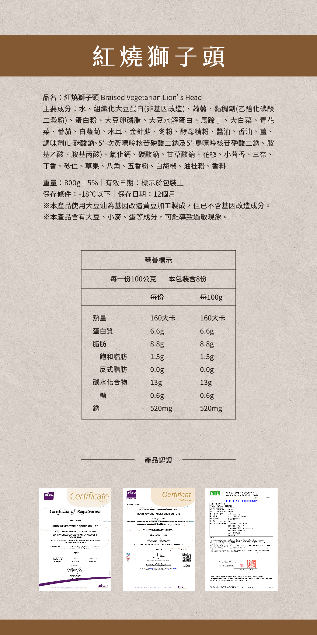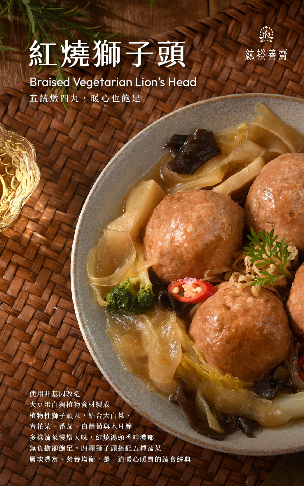 使用非基因改造大豆蛋白與植物食材製成植物性獅子頭丸,結合大白菜、青花菜、番茄、白蘿蔔與木耳等多樣蔬菜慢燉入味,紅燒湯頭香醇濃郁,無負擔卻飽足。四顆獅子頭搭配五種蔬菜,層次豐富、營養均衡,是一道暖心暖胃的蔬食經典。