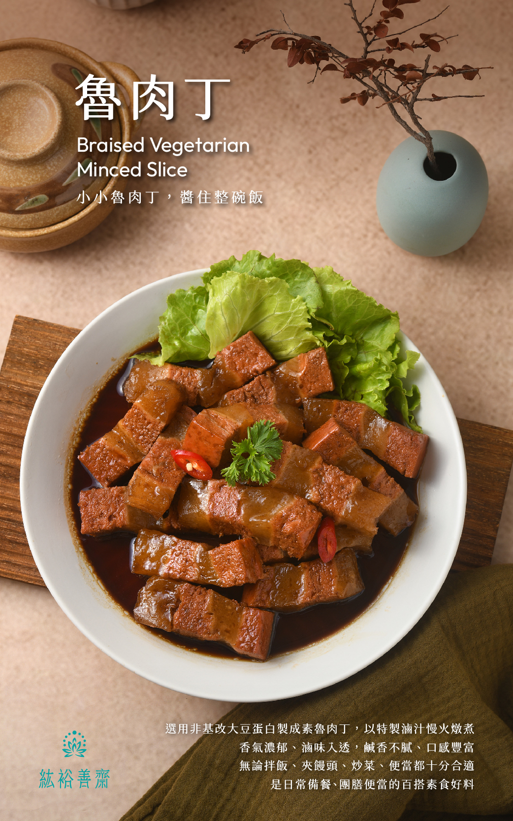 選用非基改大豆蛋白製成素魯肉丁,以特製滷汁慢火燉煮,香氣濃郁、滷味入透,鹹香不膩、口感豐富,無論拌飯、夾饅頭、炒菜、便當都十分合適,是日常備餐、團膳便當的百搭素食好料。