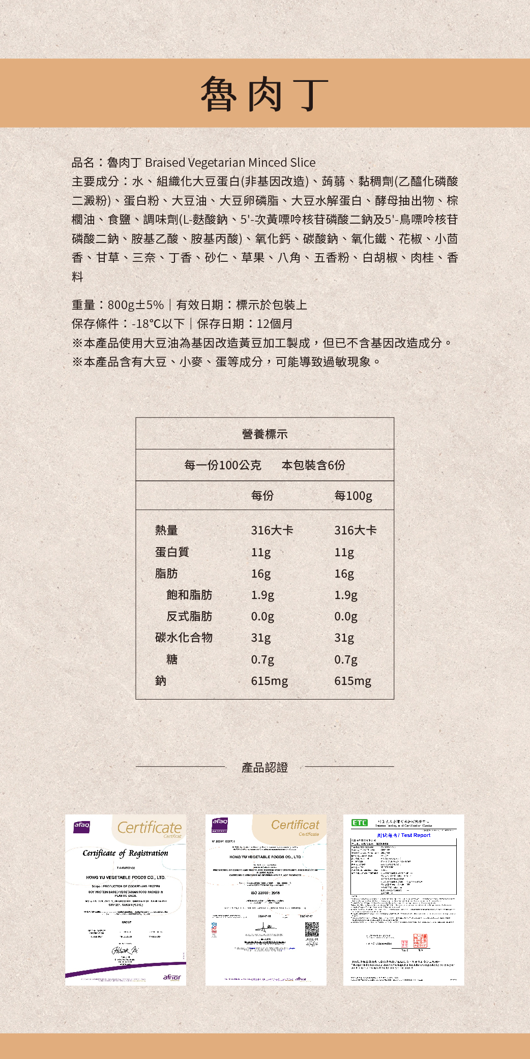■ 魯肉丁以非基改大豆蛋白製成素魯肉丁,以特製滷汁慢火熬煮,入味濃郁、色澤誘人。風味鹹香帶甘、口感層次豐富,完美還原台式滷肉飯的經典滋味,適合拌飯、夾饅頭、炒米粉、炒青菜,或作為便當配菜、團膳主食,快速加熱即可上桌,是居家與餐飲業者的絕佳備品。