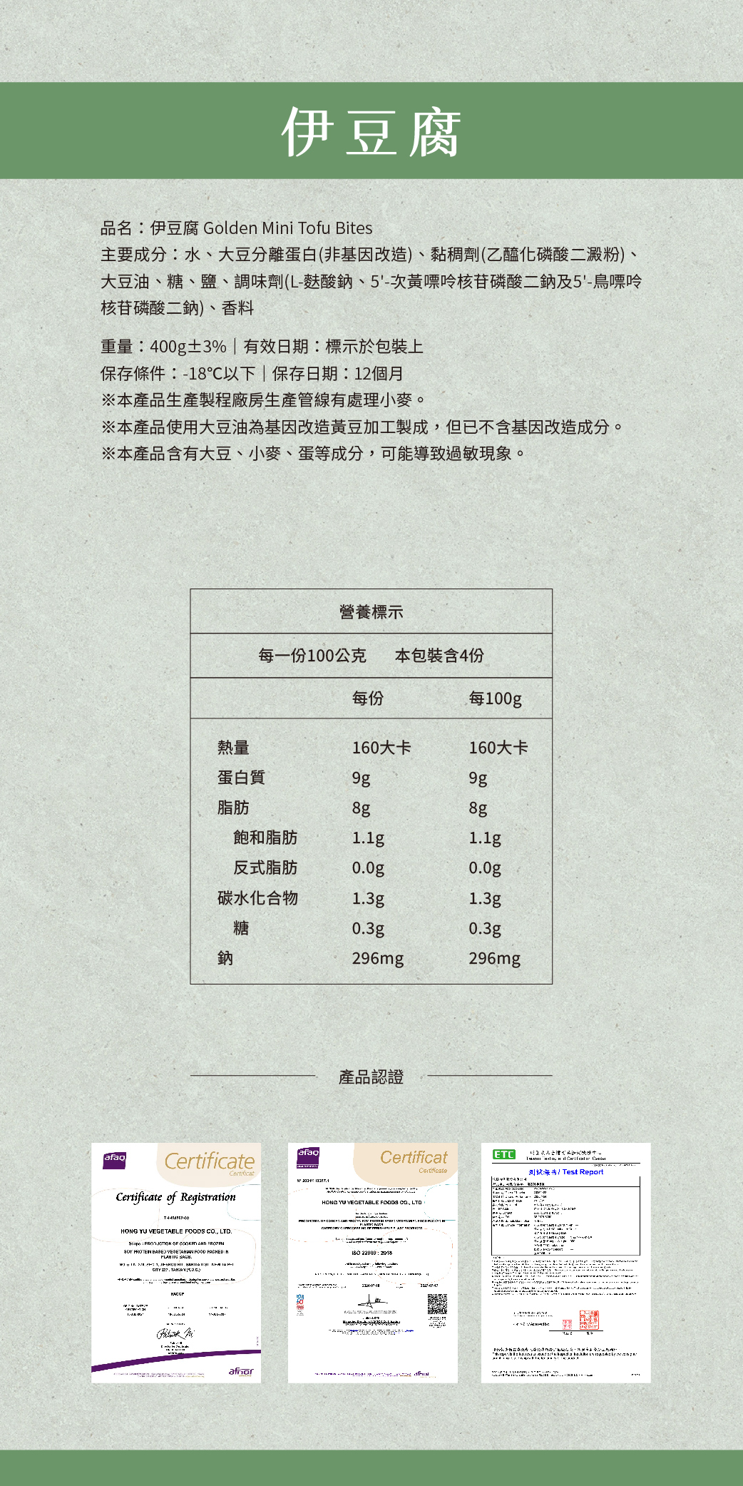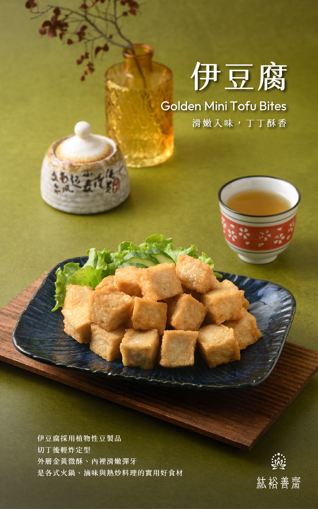 伊豆腐採用植物性豆製品切丁後輕炸定型,外層金黃微酥、內裡滑嫩彈牙,是各式火鍋、滷味與熱炒料理的實用好食材。