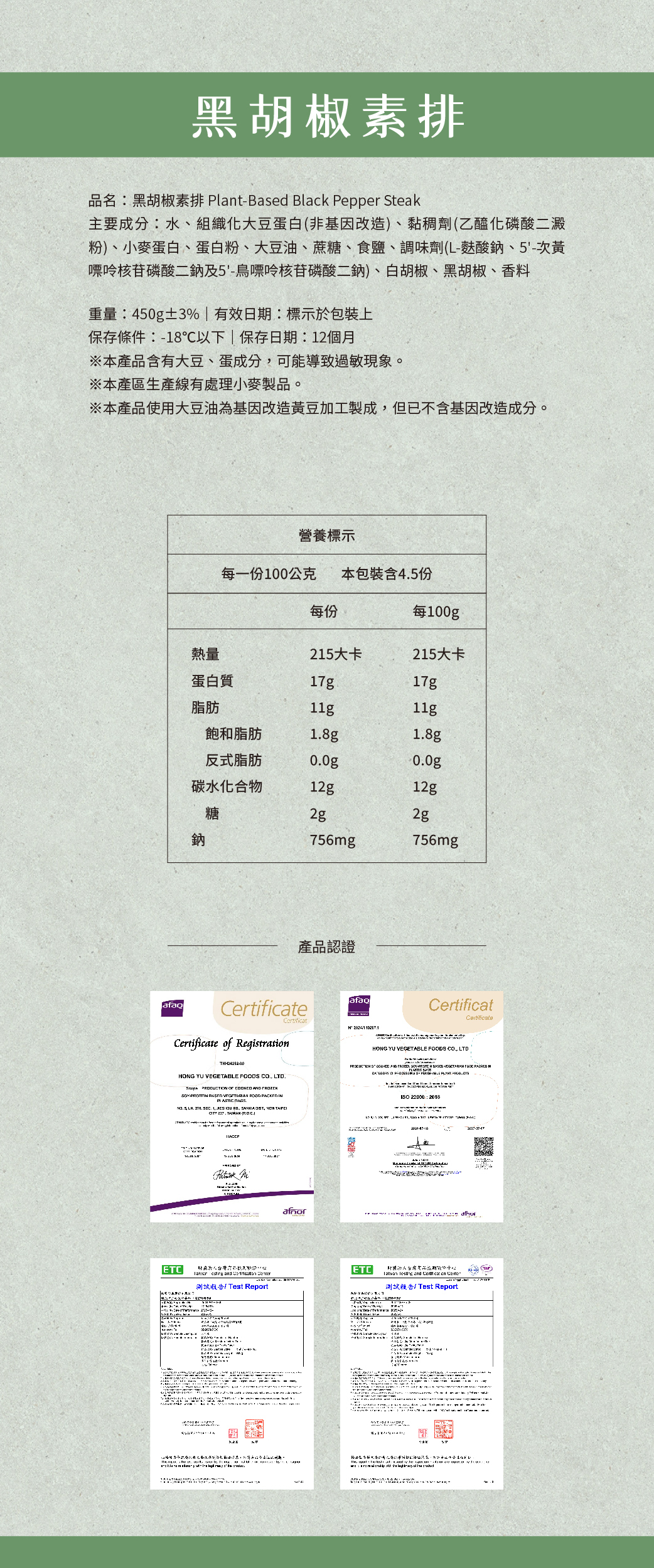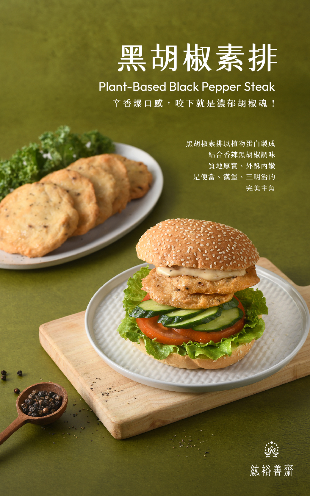 黑胡椒素排以植物蛋白製成,結合香辣黑胡椒調味,質地厚實、外酥內嫩,是便當、漢堡、三明治的完美主角。
