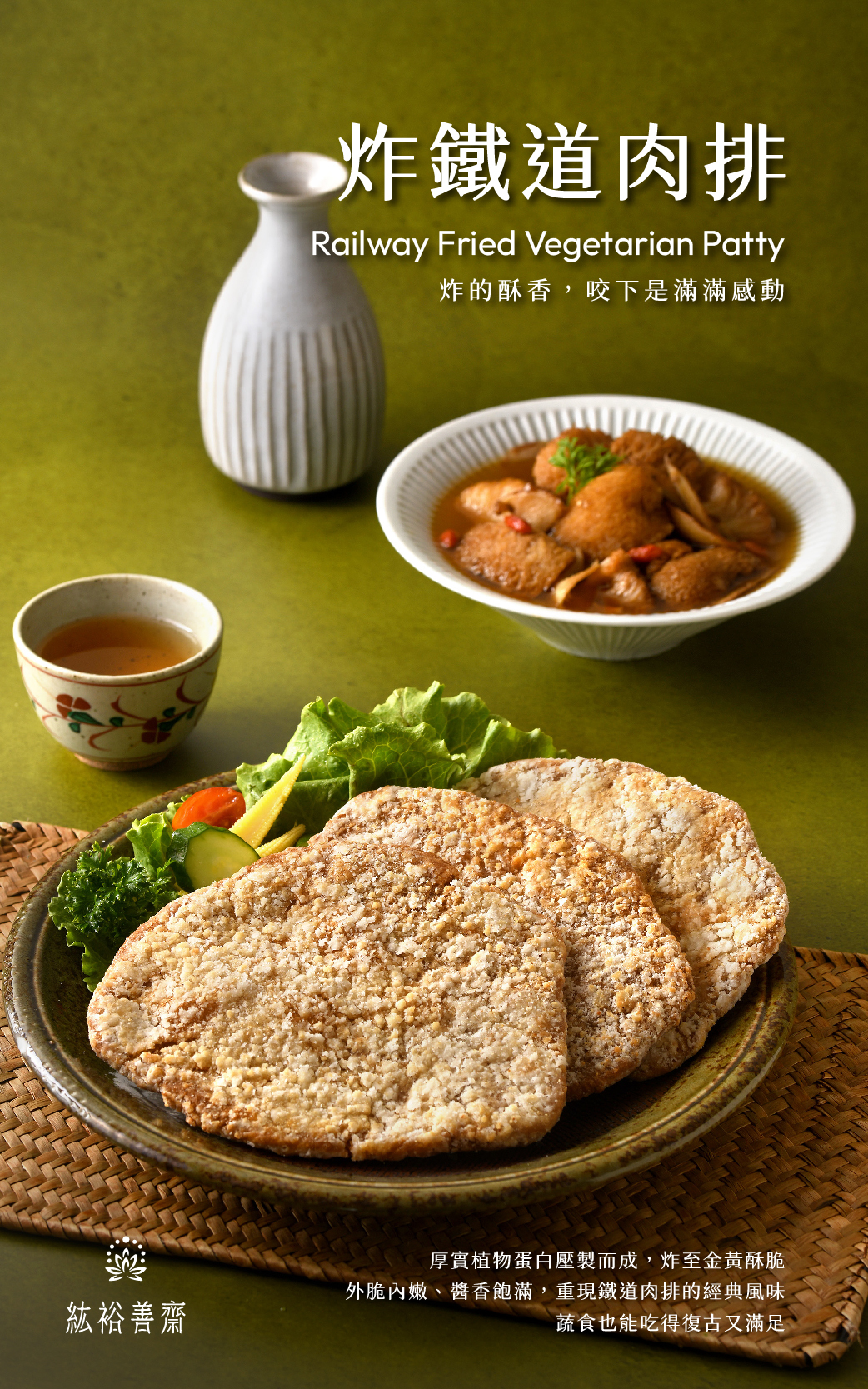厚實植物蛋白壓製而成,炸至金黃酥脆,外脆內嫩、醬香飽滿,重現鐵道肉排的經典風味,蔬食也能吃得復古又滿足。