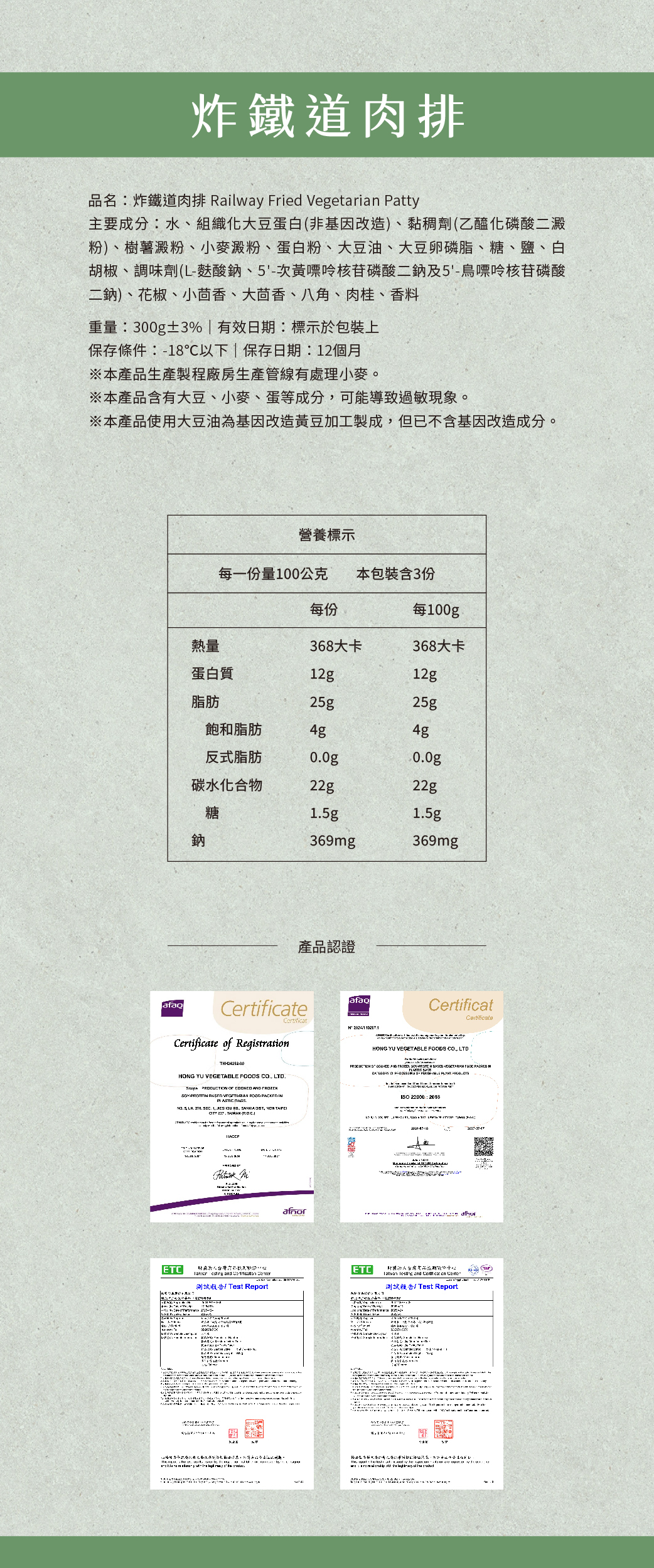 ■ 鐵道炸肉排以非基改大豆蛋白製成,經特製滷汁浸泡收味,使表皮滲透濃郁滷香,再以植物油酥炸定型,風味層次分明,外酥內嫩,口感彈牙,整體風味鹹香不膩、酥香十足,是便當、早午餐、炸物拼盤或鐵板料理的素食首選。熟凍處理,解凍加熱即可食用,輕鬆上菜零負擔