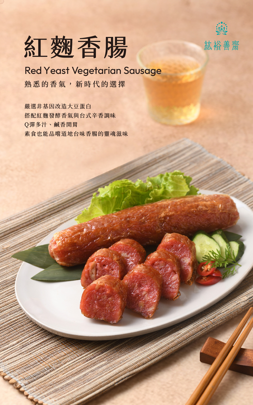 ■ 素紅麴香腸融合傳統製腸工藝與植物食材創新,加入天然紅麴、紅糟、醬油、糖及香辛料調味,經過拌合、灌製、蒸熟等步驟製成,色澤紅潤、香氣撲鼻。每口皆有紅麴獨特甘香與台式鹹香氣息,是傳統香腸的素食版演繹。