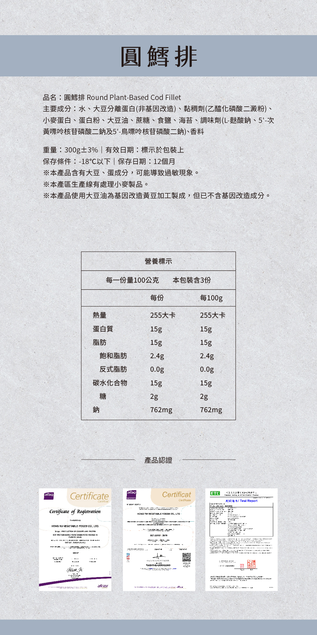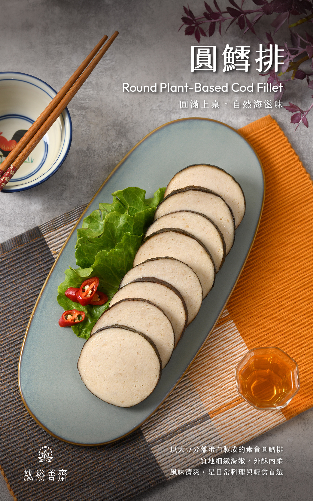 ■ 圓鱈排嚴選植物性大豆分離蛋白打造,圓形厚實外觀,模擬鱈魚排的滑嫩質感與自然色澤。無腥味、低負擔,適合煎、炸、烤等多元料理方式,讓您輕鬆享受素食新滋味。