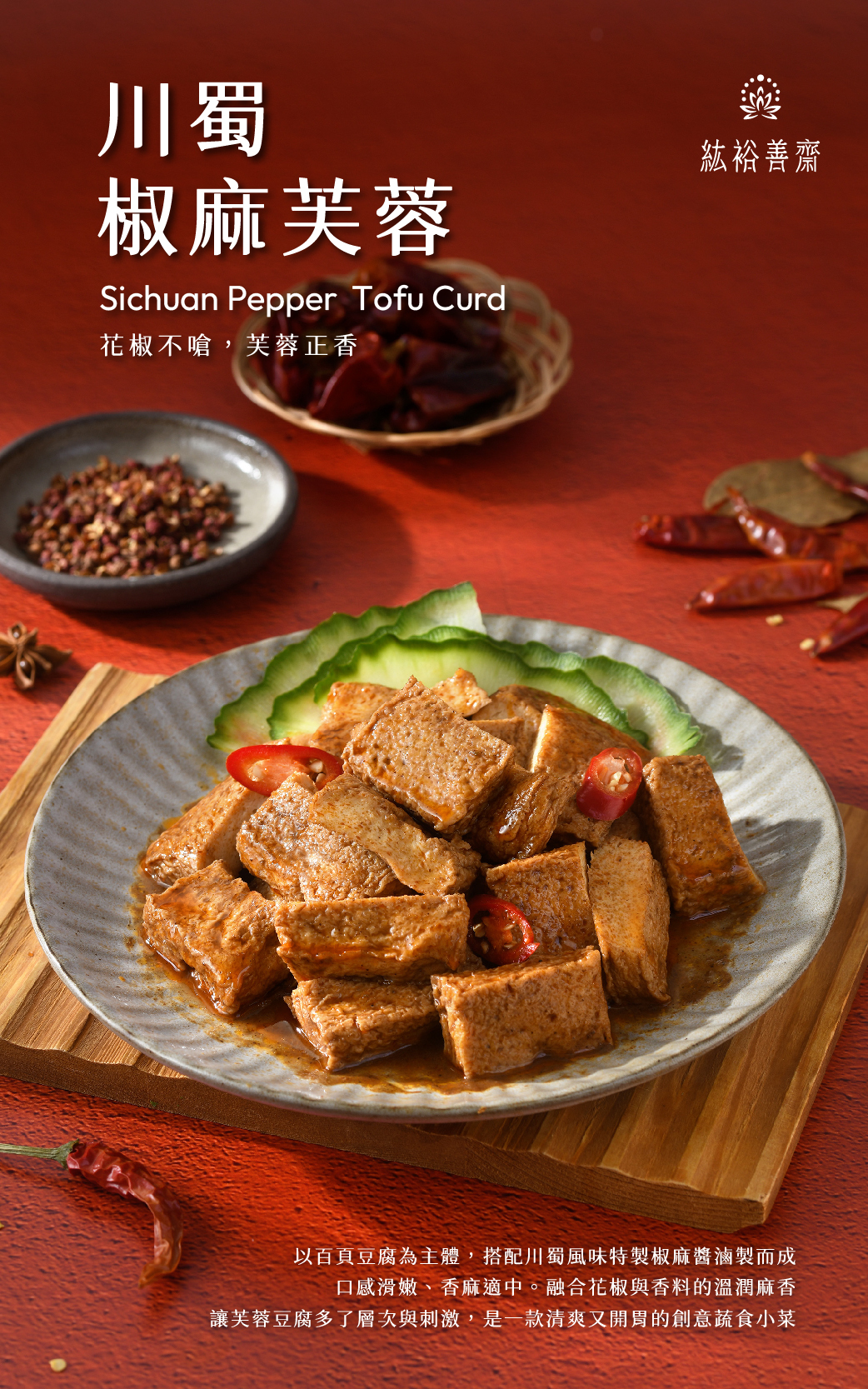以百頁豆腐為主體,搭配川蜀風味特製椒麻醬滷製而成,口感滑嫩、香麻適中。融合花椒與香料的溫潤麻香,讓芙蓉豆腐多了層次與刺激,是一款清爽又開胃的創意蔬食小菜。