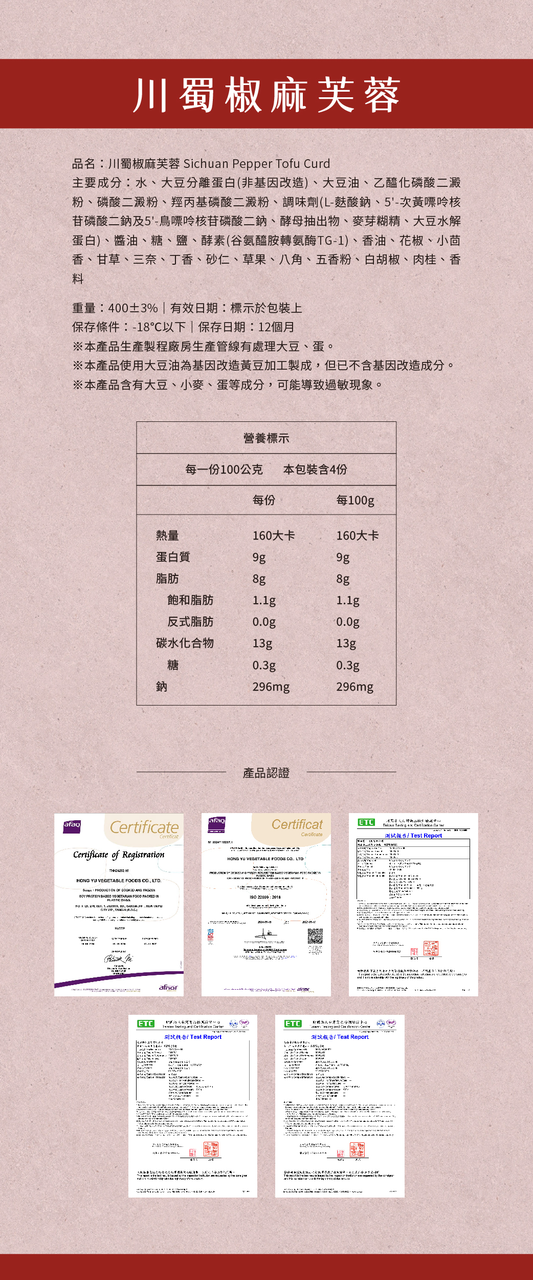 ■ 川蜀椒麻芙蓉以百頁豆腐切丁為基底,加入花椒、朝天椒、八角、香葉等川味香料,慢火滷煮至入味,並特調椒麻醬汁覆滷,使豆腐吸收花椒香氣與滷汁鹹香。整體風味麻香不嗆辣,口感滑順中帶層次,適合冷食、配飯、或作為前菜。