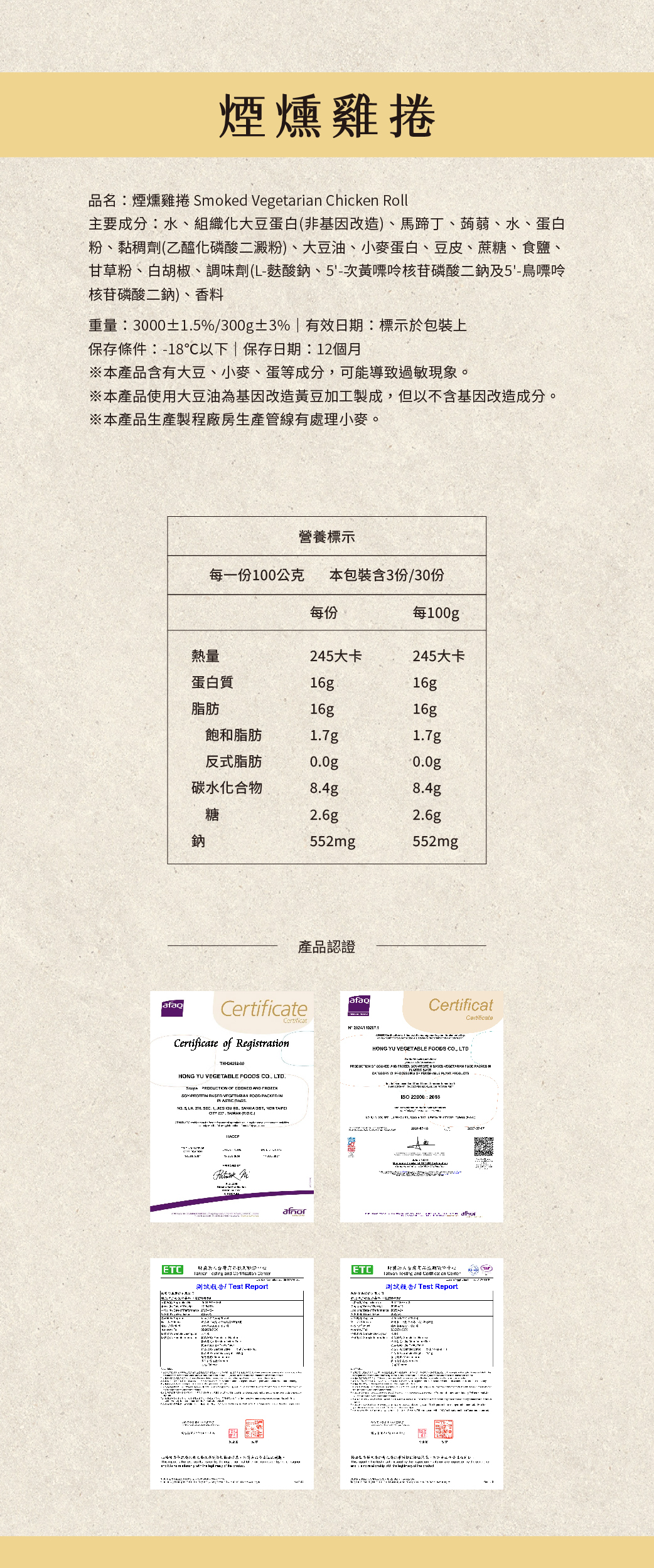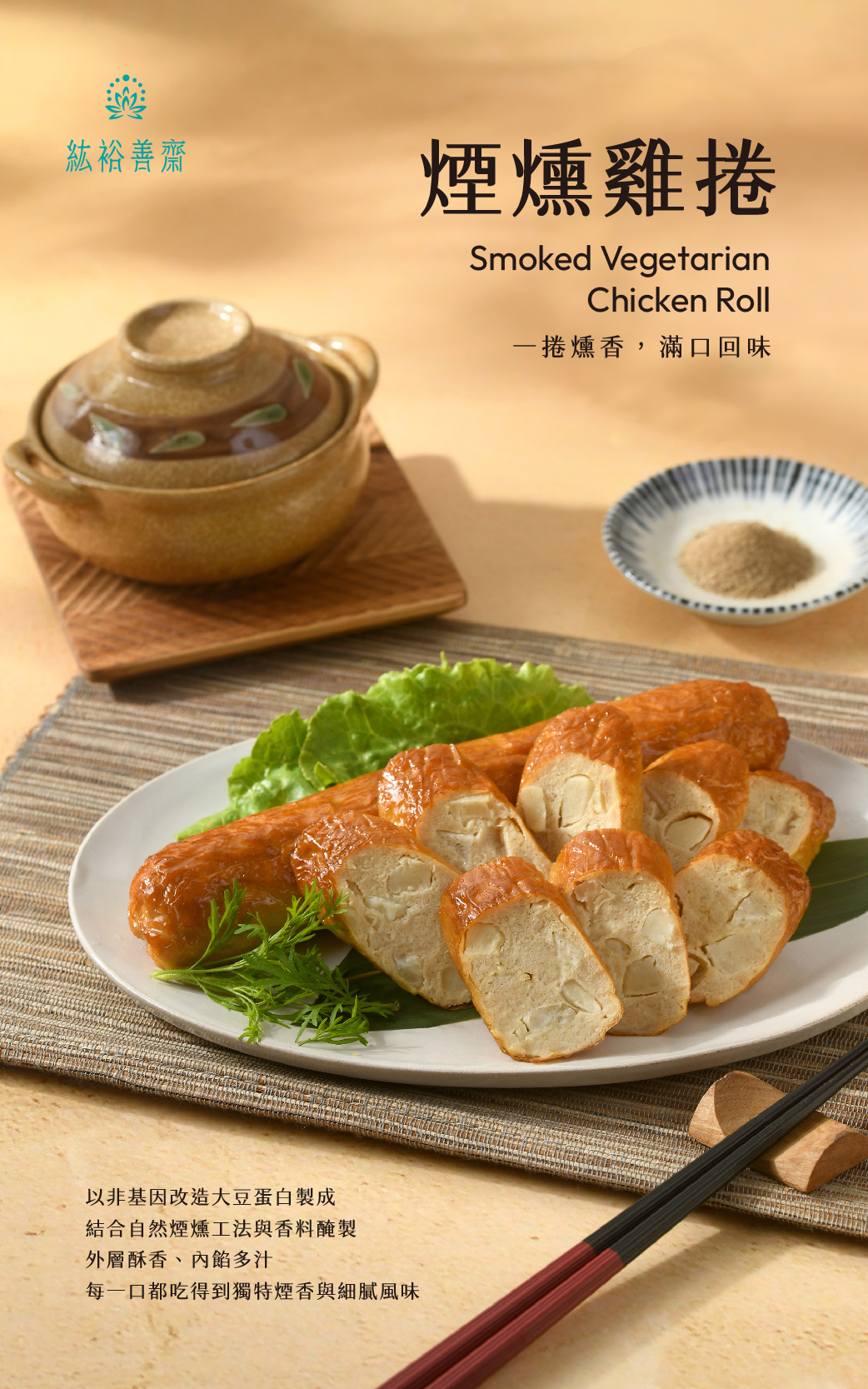 ■ 煙燻雞捲選用非基改大豆蛋白為基底,特別加入清脆的馬蹄丁與富有彈性的蒟蒻粒,打造多層次的口感體驗,經過獨門醃製程序後,再以低溫煙燻工法製成,外皮微酥、內餡香嫩,風味醇厚,無論切片涼拌、煎烤上桌或搭配便當、火鍋皆宜,是一款兼具風味與營養的蛋素美食。