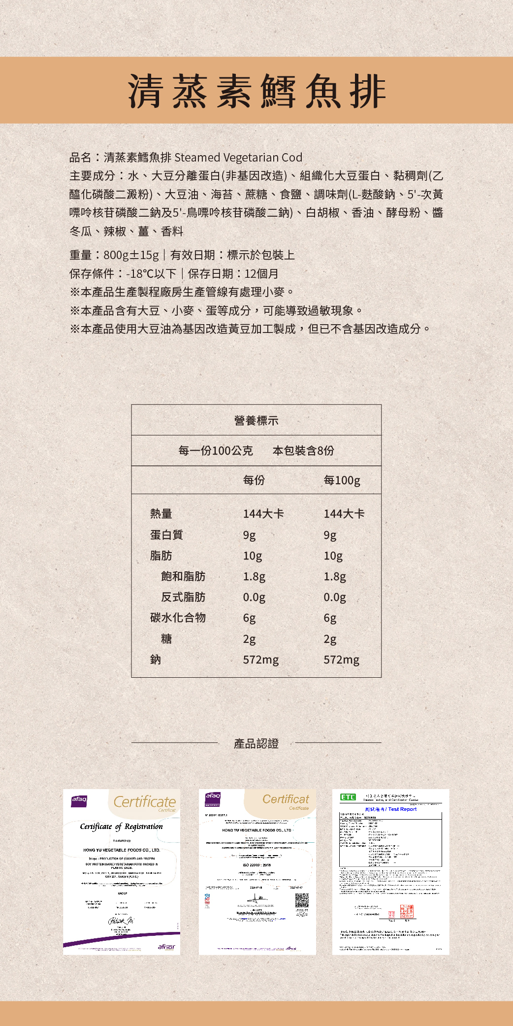 ■ 嚴選植物性蛋白精製而成,仿鱈魚排外型厚實,透過清蒸方式呈現出滑嫩、綿密的質地,口感細緻卻不鬆散。淡雅的鹹香風味、無魚腥氣,適合搭配醬油、薑絲、或淡味醬汁。適合用於便當主菜、家庭餐桌或宴席素食應用。