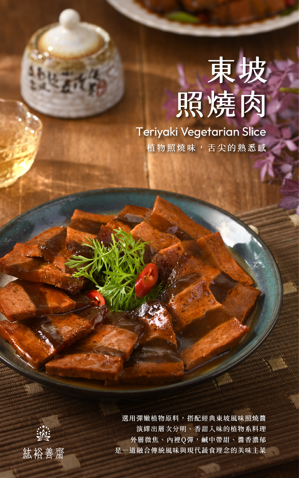 東坡照燒肉以嚴選植物性食材為基底,經過汆燙、調味、拌炒等工序,最後加入特製照燒醬收汁調味,香氣層次豐富、色澤誘人,不含動物性成分與五辛,適合日常家庭餐桌或健康便當菜色使用。