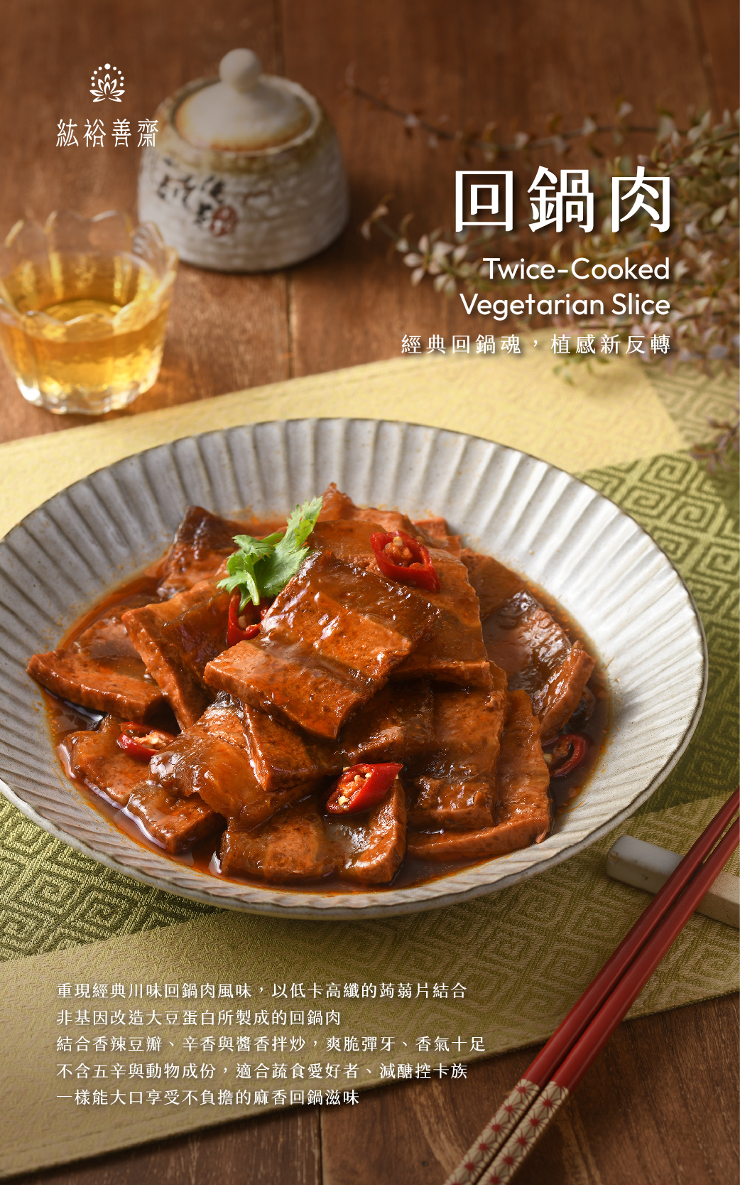 重現經典川味回鍋肉風味,以低卡高纖的蒟蒻片結合非基因改造大豆蛋白所製成的回鍋肉,結合香辣豆瓣、辛香與醬香拌炒,爽脆彈牙、香氣十足。不含五辛與動物成份,適合蔬食愛好者、減醣控卡族,一樣能大口享受不負擔的麻香回鍋滋味。