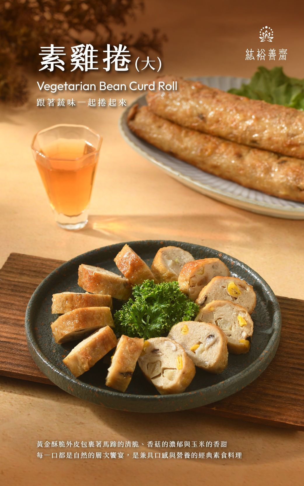 黃金酥脆外皮包裹著馬蹄的清脆、香菇的濃郁與玉米的香甜,每一口都是自然的層次饗宴,是兼具口感與營養的經典素食料理。