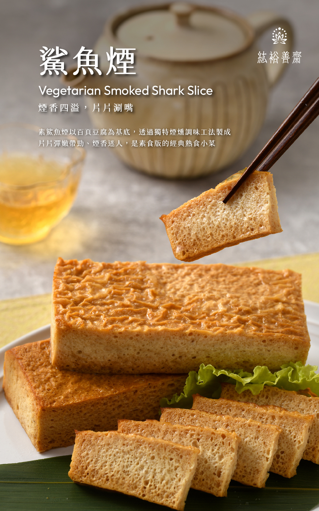 素鯊魚煙以百頁豆腐為基底,透過獨特煙燻調味工法製成,片片彈嫩帶勁、煙香迷人,是素食版的經典熟食小菜。
