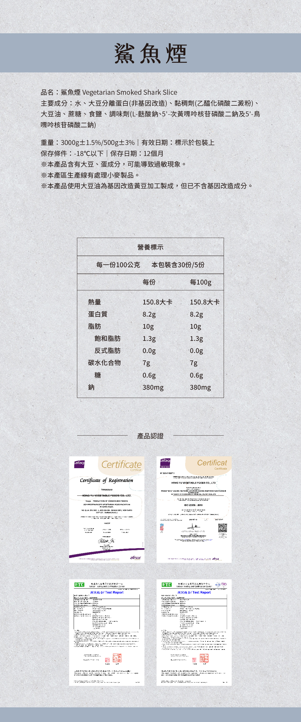 ■ 選用質地細緻的百頁豆腐,經調味後低溫煙燻,使每片素鯊魚煙皆呈現出微微透明感與自然金黃色澤。口感滑嫩Q彈、風味醇厚濃郁,無動物成分,是健康與美味兼具的經典小菜選擇。
